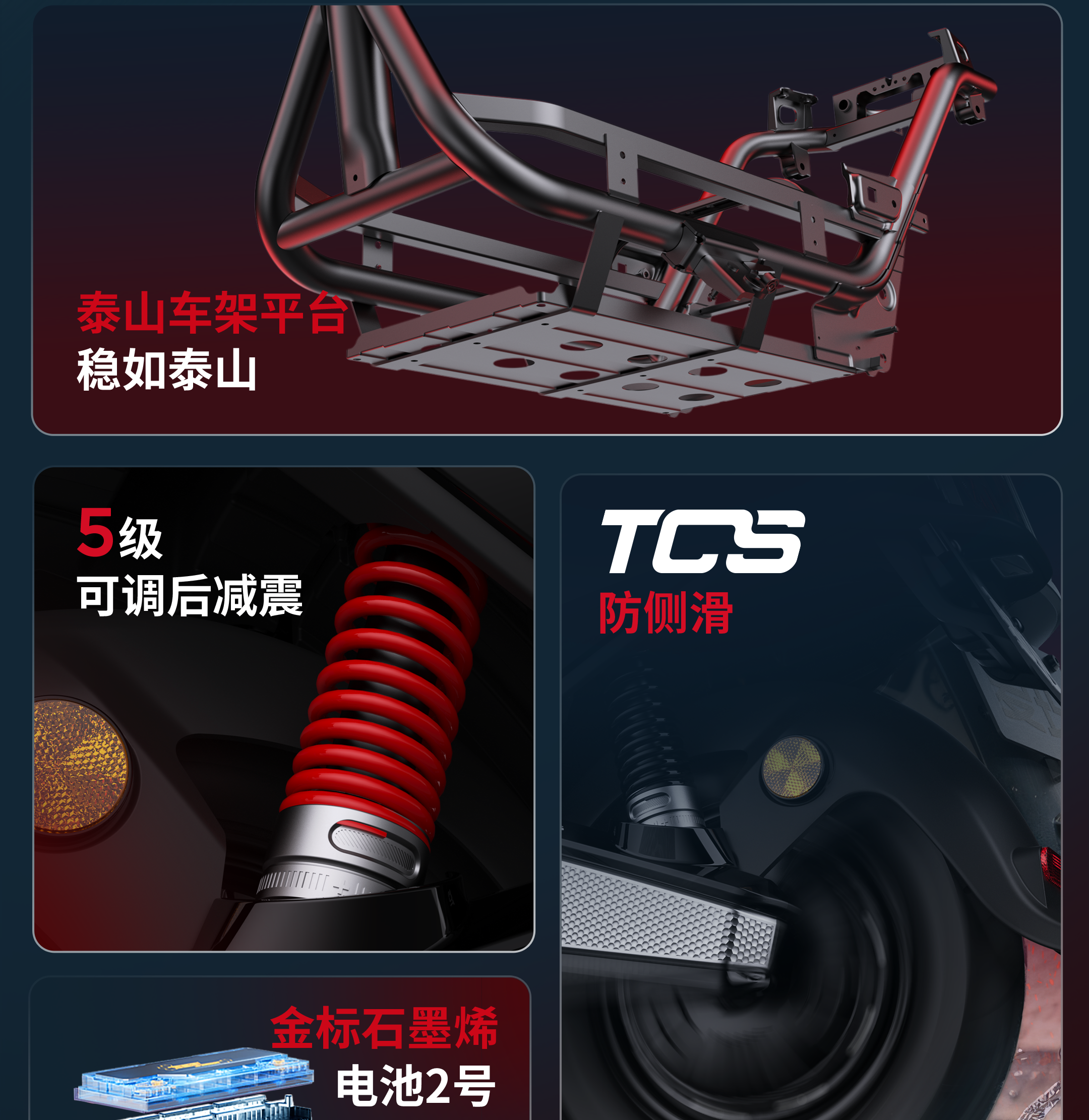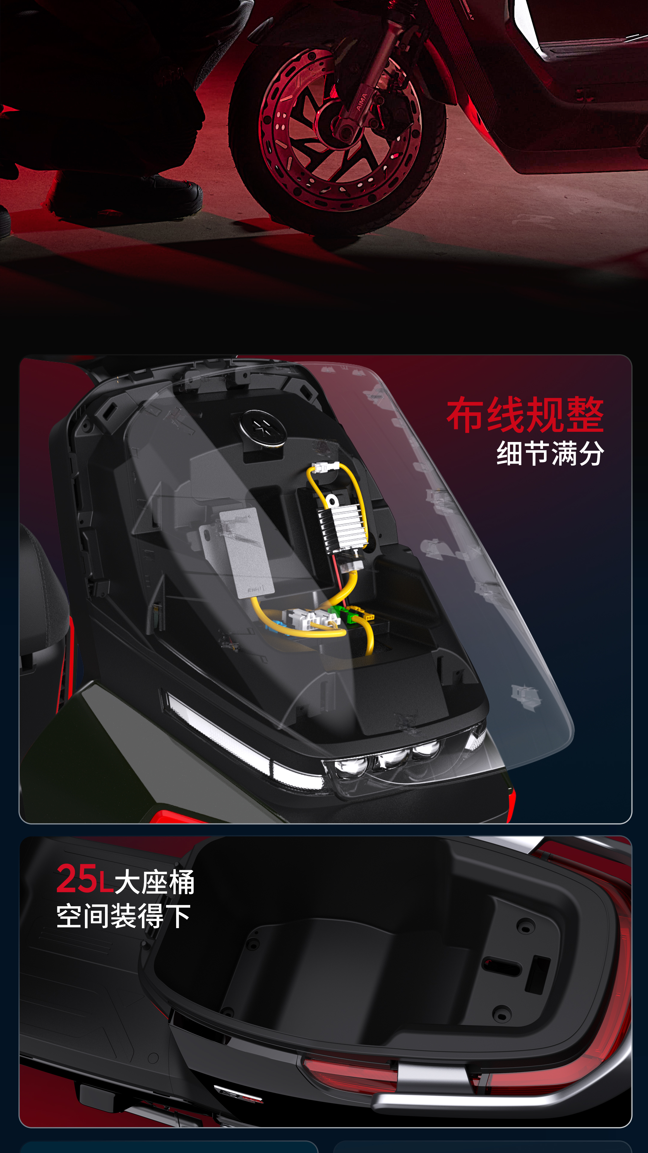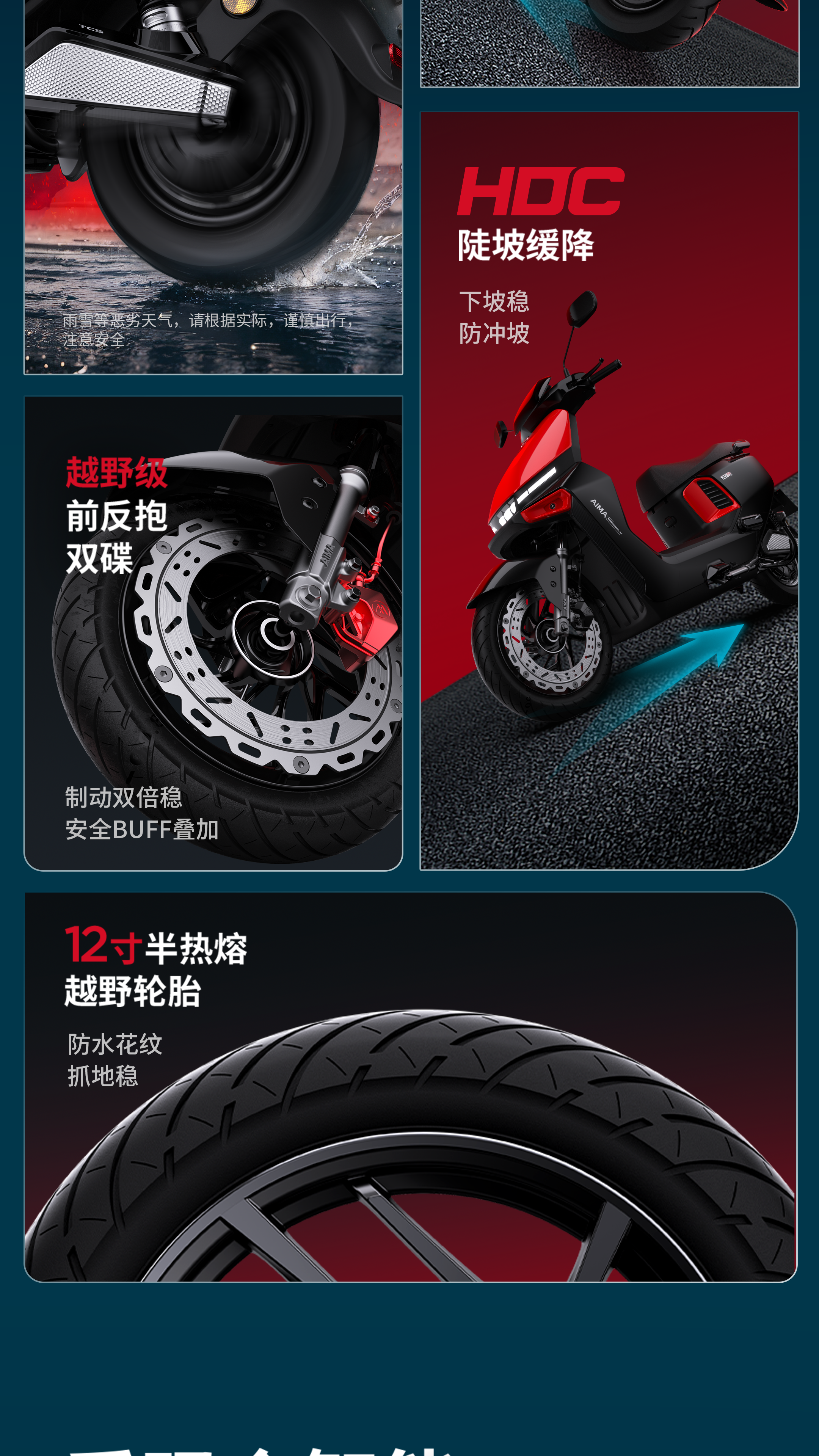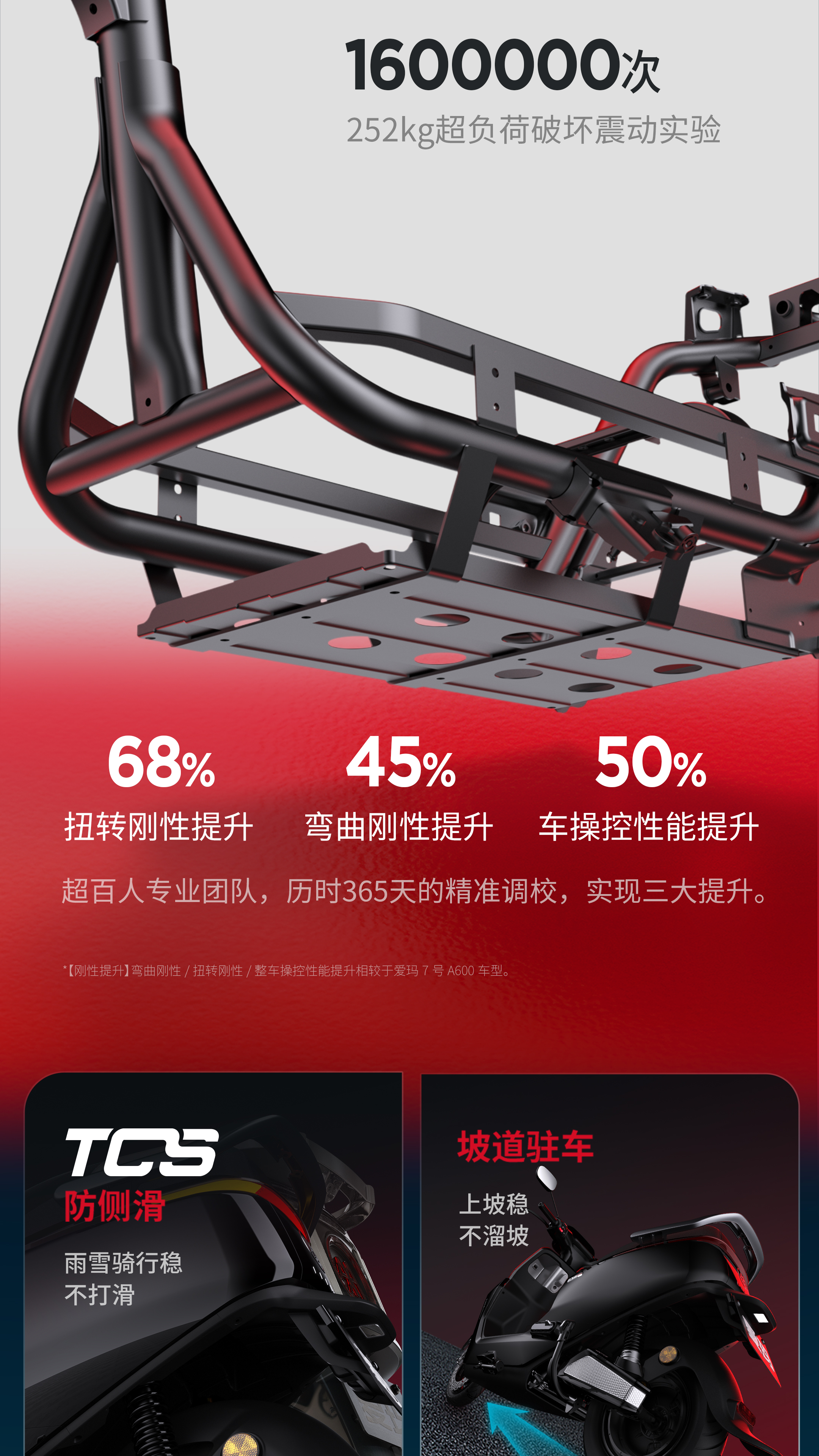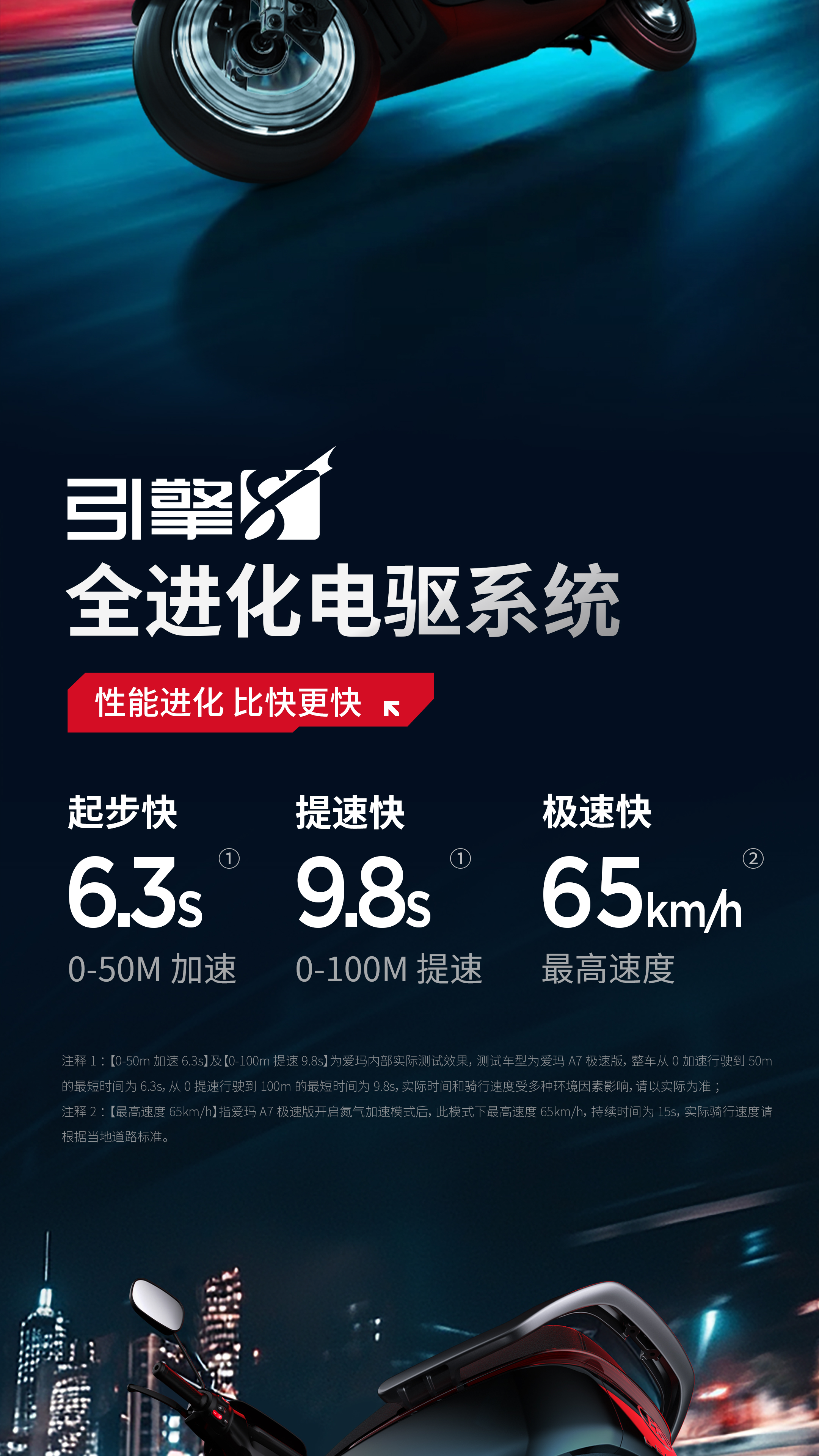 注釋2:【最高速度65km/h】指開云體育A7極速版開啟氮氣加速模式后,此模式下最高速度65km/h,持續時間為15s,實際騎行速度請根據當地道路標準。